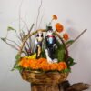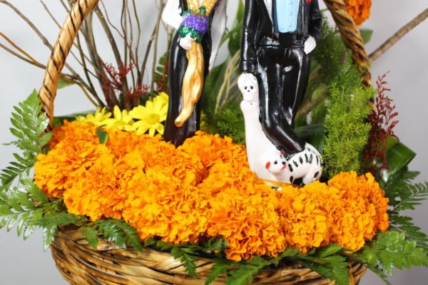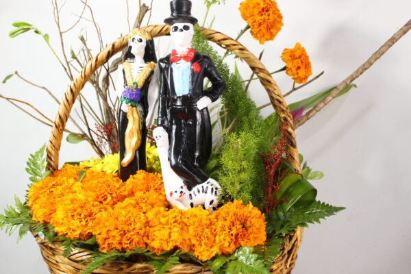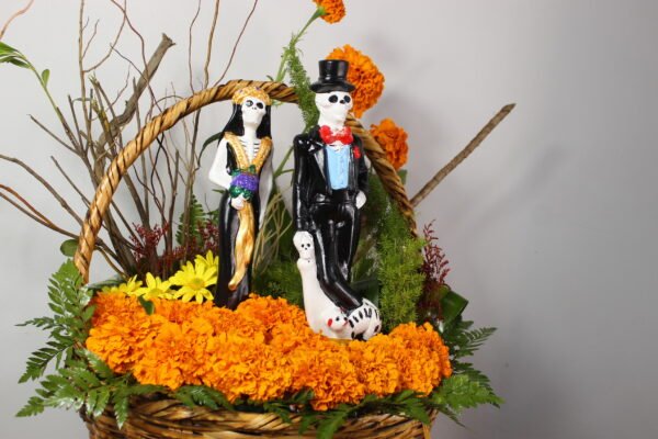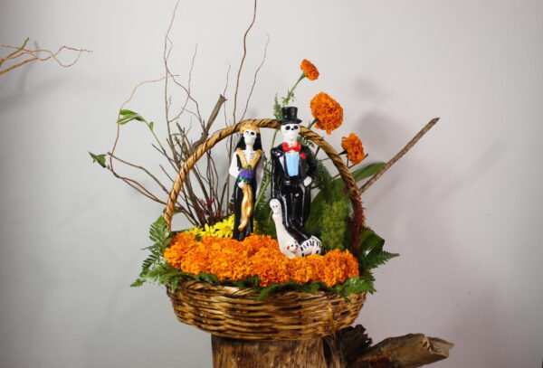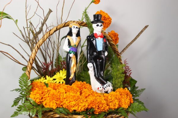 Este hermoso arreglo combina el simbolismo del cempasúchil con elegantes figuras de catrines, representando la esencia del Día de Muertos. Elaborado en una canasta artesanal, es ideal para decorar tu hogar, altar u ofrenda, brindando un toque de tradición y cultura mexicana. Cada detalle ha sido cuidadosamente pensado para honrar a tus seres queridos en esta celebración tan especial.