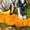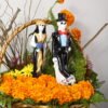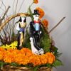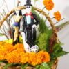 Celebra con este arreglo tradicional de cempasúchil y figuras de catrines, perfecto para decorar o incluir en una ofrenda.