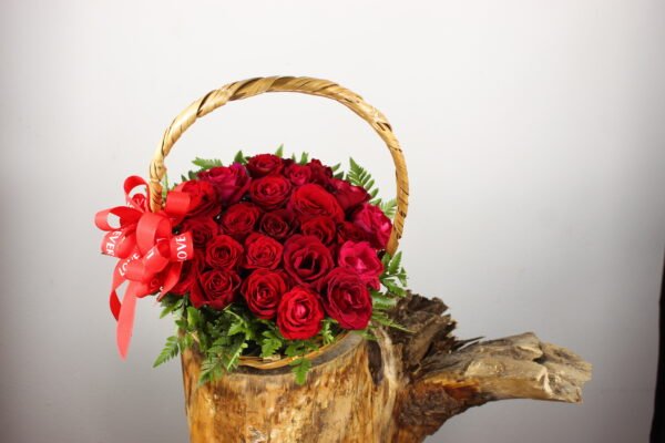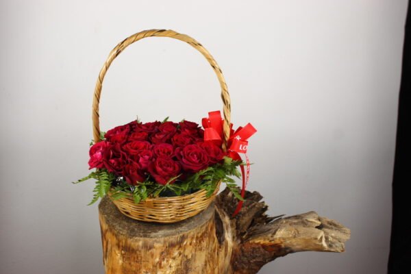 “Canasta rústica de rosas rojas” presenta un arreglo clásico y romántico. Una abundante selección de rosas rojas profundas llena una canasta de mimbre tradicional con asa. El follaje verde enmarca las flores, aportando un contraste natural. Un lazo rojo brillante con la palabra “Love” adorna un lado, añadiendo un toque festivo y declaración de afecto. La combinación de la canasta rústica con las elegantes rosas crea un equilibrio entre lo tradicional y lo sofisticado. Ideal para San Valentín, aniversarios o como gesto romántico, este arreglo transmite un mensaje de amor duradero y sincero.