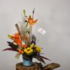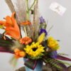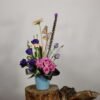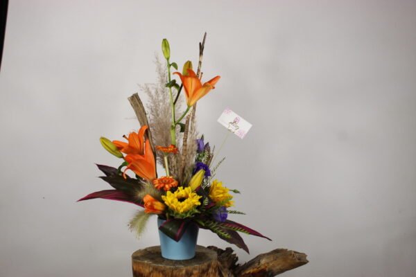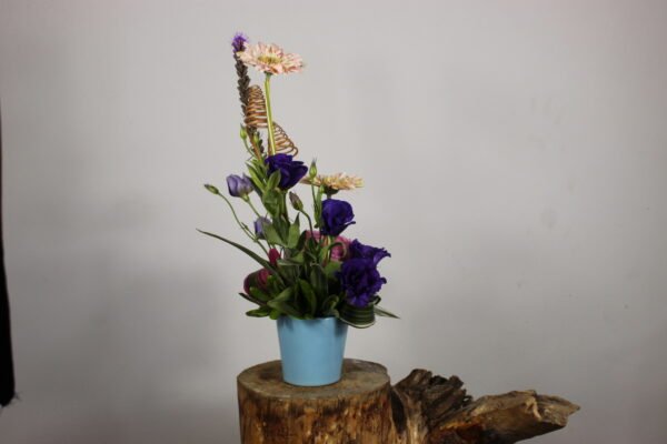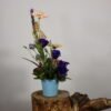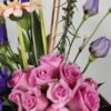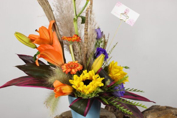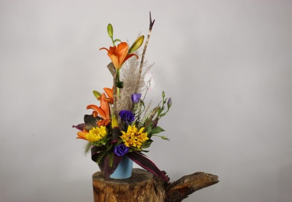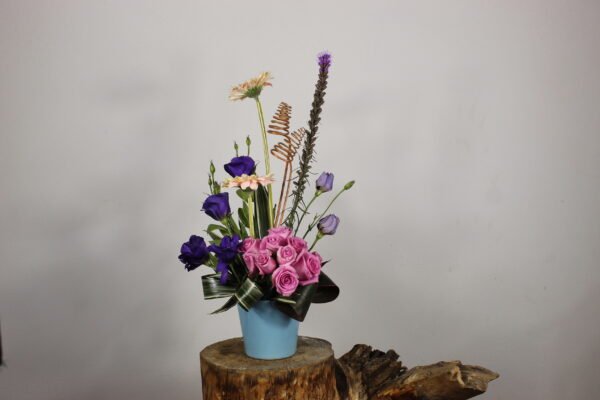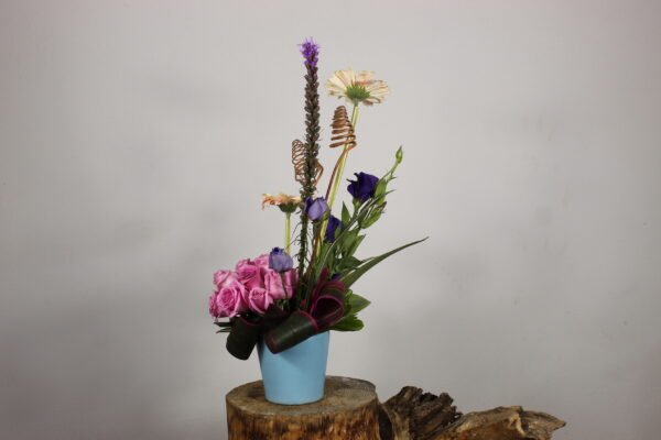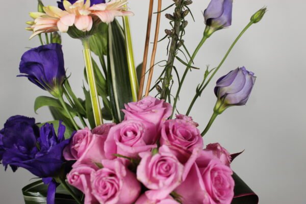 Este deslumbrante arreglo floral presenta una base azul vibrante que aporta un toque moderno y fresco. En su interior, se despliegan hermosas rosas en suaves tonos, acompañadas de lisianthus morados que añaden un contraste elegante y llamativo. Las rosas simbolizan el amor y la belleza, mientras que los lisianthus aportan un aire de sofisticación y misterio. Este conjunto es perfecto para alegrar cualquier ambiente, desde un acogedor salón hasta un evento especial. La combinación de colores crea una armonía visual que cautiva la vista y eleva el estado de ánimo. Ideal para regalar o para adornar tu hogar, este arreglo floral es una verdadera obra de arte natural. Una explosión de belleza que invita a disfrutar de cada momento