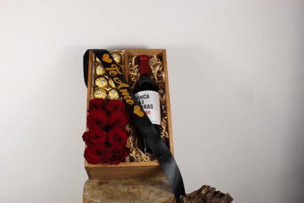 Este sofisticado porta vino es la fusión perfecta de elegancia y dulzura. Diseñado para realzar la experiencia de disfrutar una buena botella de vino, está adornado con rosas frescas que añaden un toque de romance y frescura. Las rosas, en vibrantes tonos, complementan la belleza del porta vino y crean una presentación encantadora. Además, incluye deliciosos chocolates gourmet, que invitan a un momento de indulgencia y celebración. Ideal para aniversarios, cumpleaños o cualquier ocasión especial, este porta vino es un regalo único que dejará una impresión duradera.